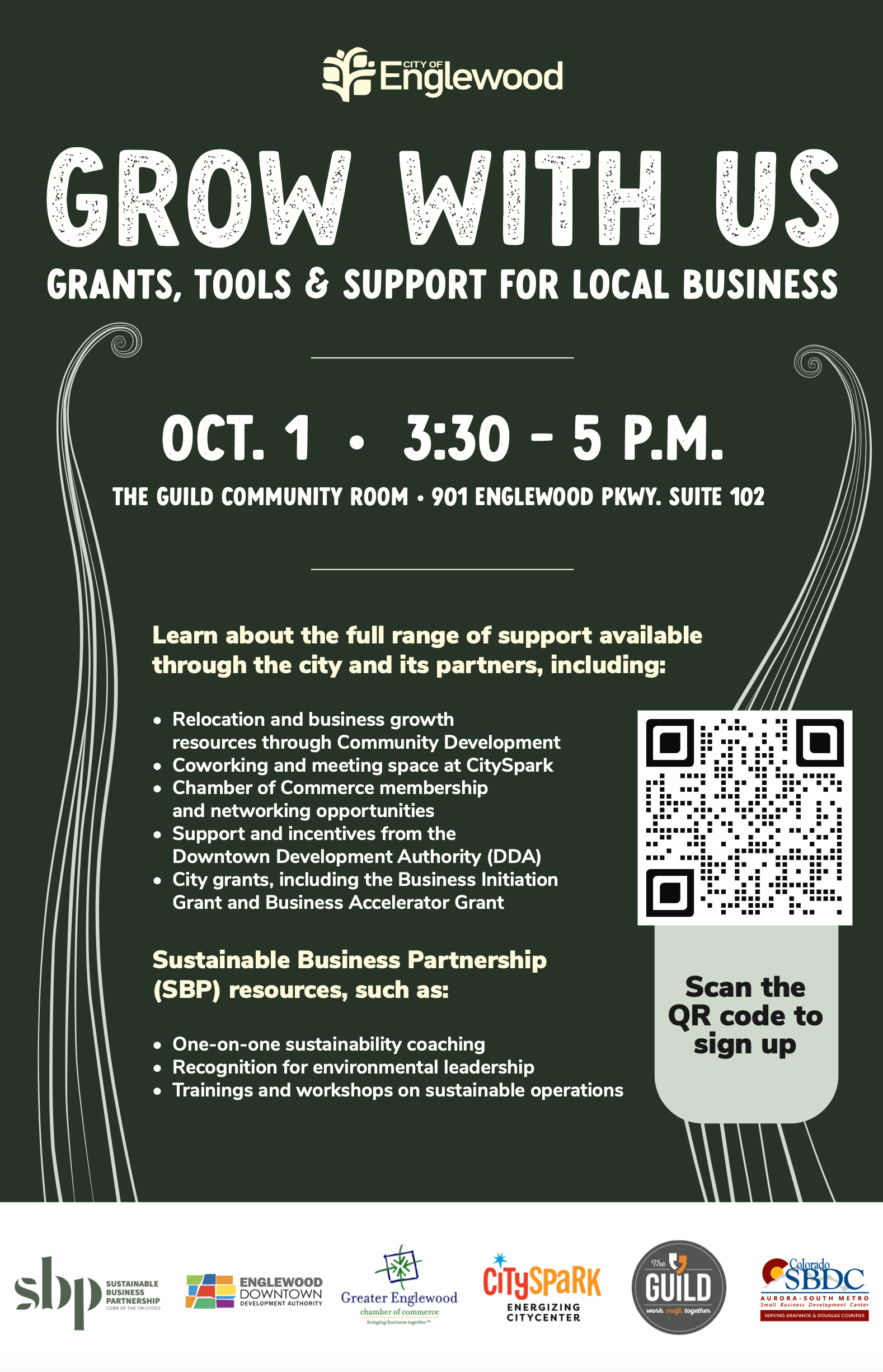 Grow With Us: Grants, Tools, and Support for Local Business — Wednesday, October 1, 3:30–5:00 p.m. at The Guild Community Room, 901 Englewood Parkway, Suite 102, Englewood, CO 80110.